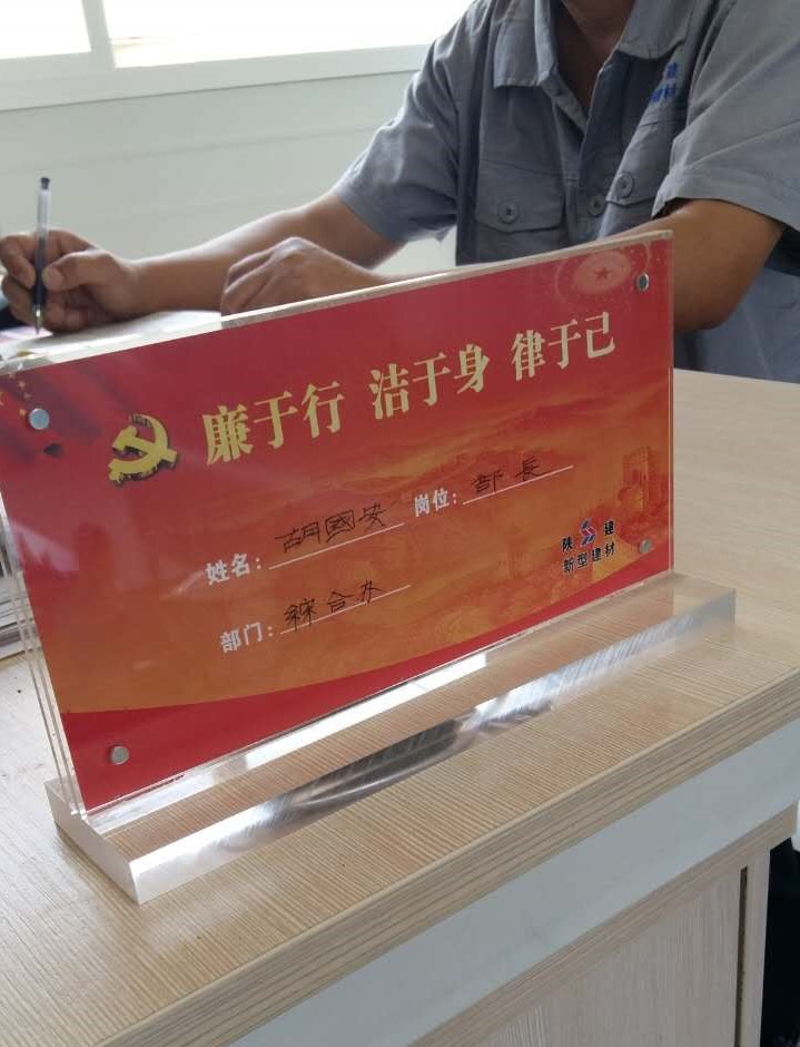 日前,陜建新型建材有限公司在學(xué)習(xí)貫徹《中國共產(chǎn)黨廉潔自律準(zhǔn)則》和《中國共產(chǎn)黨紀(jì)律處分條例》中,開拓思路、創(chuàng)新形式,為黨員領(lǐng)導(dǎo)干部制發(fā)了廉潔自律警示桌牌。 廉潔桌牌正面印有“廉于行,潔于身,律于己”警句及姓名、崗位、部門;背面印有“黨員廉潔自律規(guī)范”。要求全體黨員干部以黨員廉潔自律規(guī)范條款規(guī)定為內(nèi)容,自覺提升思想道德境界,堅(jiān)持公私分明,先公后私,克己奉公;堅(jiān)持崇廉拒腐,清白做人,干凈做事;堅(jiān)持尚儉戒奢,艱苦樸素,勤儉節(jié)約;堅(jiān)持吃苦在前,享受在后,甘于奉獻(xiàn)。廉政桌牌,彰顯著新型建材濃厚的廉政文化氛圍。